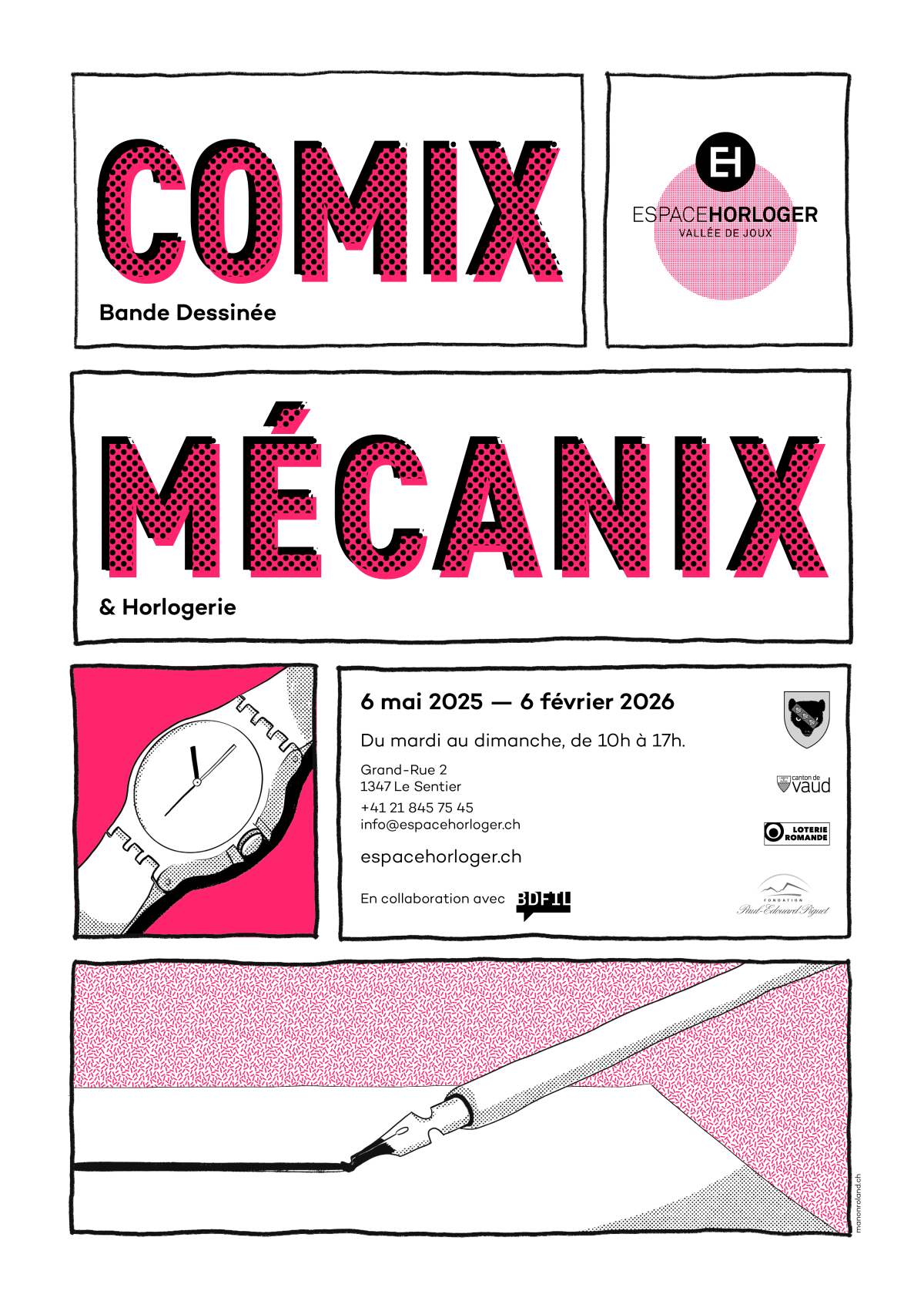 Affiche de l'exposition Comix Mécanix à l'Espace Horloger de la Vallée de Joux, 2025